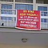 Ağır hasarlı pankartı asılan binayı görenler bir daha bakıyor