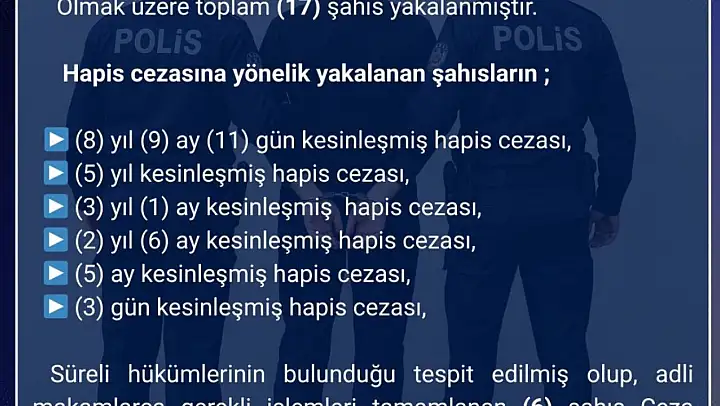 Bingöl İl Emniyet Müdürlüğü ekiplerince 5-12 Eylül 2025 tarihleri arasında gerçekleştirilen çalışmalarda, haklarında çeşitli suçlardan arama kaydı bulunan 17 kişi yakalandı. Yapılan çalışmalarda, haklarında kesinleşmiş hapis cezası bulunan 6 şahıs tutuklanarak cezaevine gönderildi.