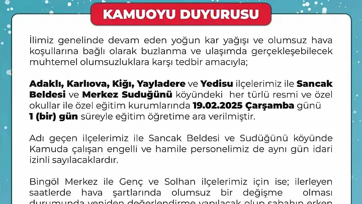 Bingöl Valiliği'nden yapılan açıklamada, 'İlimiz genelinde devam eden yoğun kar yağışı ve olumsuz hava şartlarına bağlı olarak buzlanma ve ulaşımda gerçekleşebilecek muhtemel olumsuzluklara karşı tedbir amacıyla; Adaklı, Karlıova, Kiğı, Yayladere ve Yedisu ilçelerimiz ile Sancak Beldesi ve Merkez Suduğünü köyündeki her türlü resmi ve özel okullar ile özel eğitim kurumlarında 19.02.2025 Çarşamba günü 1 (bir) gün süreyle eğitim öğretime ara verilmiştir. Adı geçen ilçelerimiz ile Sancak Beldesi ve Sudüğünü köyünde Kamuda çalışan engelli ve hamile personelimiz de aynı gün idari izinli sayılacaklardır. Bingöl Merkez ile Genç ve Solhan ilçelerimiz için ise; ilerleyen saatlerde hava şartlarında olumsuz bir değişme olması durumunda yeniden değerlendirme yapılacak olup sabahın erken saatlerinde kamuoyu bilgilendirilecektir. Kamuoyuna saygıyla duyurulur' denildi.