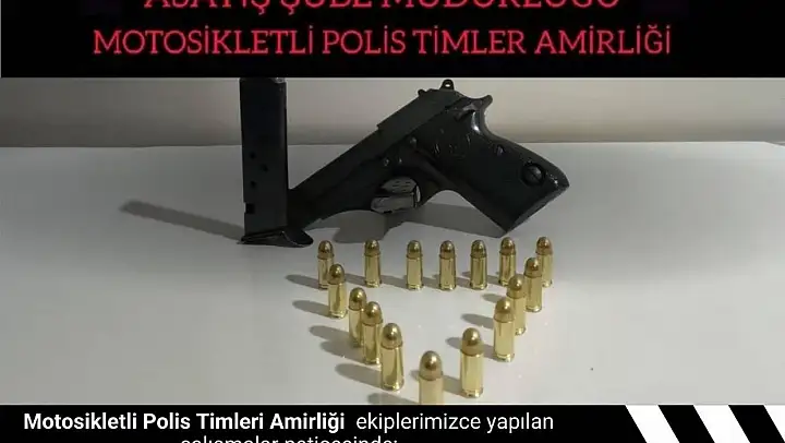Bingöl Emniyet Müdürlüğü Motosikletli Polis Timleri Amirliğince yapılan çalışmalar kapsamında 1 adet ruhsatsız tabanca, 2 adet şarjör, 16 adet 9 milimetre çapında fişek ele geçirildi. Şüpheli şahıs hakkında adli işlem başlatıldı.
