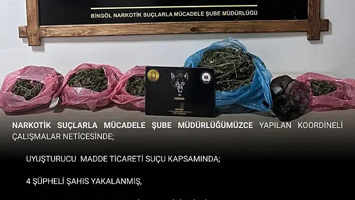 Bingöl İl Emniyet Müdürlüğü'ne bağlı Narkotik Suçlarla Mücadele Şube Müdürlüğü ekiplerince yapılan çalışmalarda, 1 kilo 782 gram esrar maddesi ele geçirildi. Operasyonda uyuşturucu ticareti yaptığı tespit edilen 4 şüpheli gözaltına alındı. Emniyetteki işlemleri tamamlanan şüpheliler adliyeye sevk edildi. Mahkemece 1 şahıs adli kontrol şartıyla serbest bırakılırken, 3 şahıs ise tutuklanarak cezaevine gönderildi.