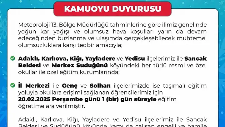 Bingöl Valiliğinden yapılan açıklamada, 'Meteoroloji 13. Bölge Müdürlüğü tahminlerine göre ilimiz genelinde yoğun kar yağışı ve olumsuz hava koşulları yarın da devam edeceğinden buzlanma ve ulaşımda gerçekleşebilecek muhtemel olumsuzluklara karşı tedbir amacıyla, Adaklı, Karlıova, Kiğı, Yayladere ve Yedisu ilçelerimiz ile Sancak beldesi ve merkez Sudüğünü köyündeki her türlü resmi ve özel okullar ile özel eğitim kurumlarında, il merkezi ile Genç ve Solhan ilçelerimizde ise taşımalı eğitim yoluyla okullara erişimi sağlanan öğrencilerimiz için 20 Şubat Perşembe günü 1 gün süreyle eğitim öğretime ara verilmiştir. Adaklı, Karlıova, Kiğı, Yayladere ve Yedisu ilçelerimiz ile Sancak beldesi ve Sudüğünü köyünde kamuda çalışan engelli ve hamile personelimiz aynı gün idari izinli saylacaklardır' denildi.