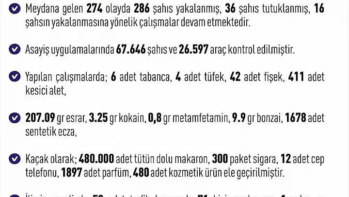 Elazığ Valiliği, 7-14 Temmuz 2025 tarihleri arasındaki asayiş raporunu paylaştı. Kent genelinde güvenlik güçlerinin müdahale ettiği 274 olayda toplam 286 kişi yakalandı. Yakalananlardan 36'sı tutuklanırken, 16 şüpheliyi yakalama çalışmaları sürüyor. Bir haftalık denetimlerde 67 bin 646 kişi ve 26 bin 597 araç kontrol edildi. Bu uygulamalarda 6 tabanca, 4 tüfek, 42 fişek ile 411 kesici alet ele geçirildi. Uyuşturucuyla mücadele kapsamında ise 207,09 gram esrar, 3,25 gram kokain, 0,8 gram metamfetamin, 9,9 gram bonzai ve bin 678 adet sentetik ecza bulundu. Kaçakçılıkla mücadelede de 480 bin dolu makaron, 300 paket sigara, 12 cep telefonu, bin 897 parfüm ve 480 kozmetik ürün ele geçirildi.