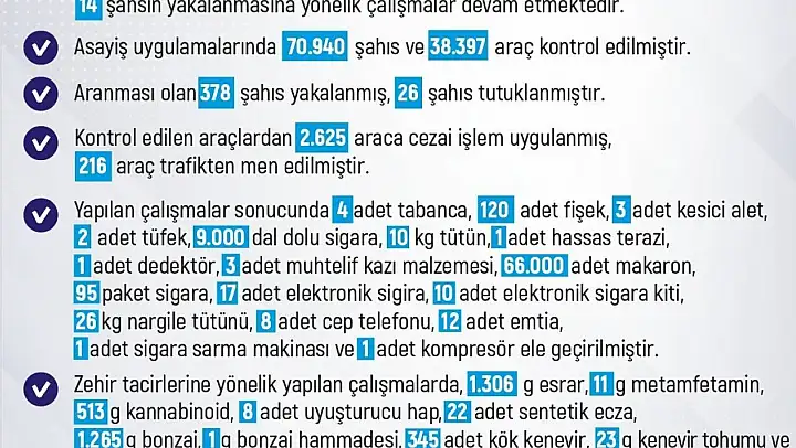 Zehir tacirlerine yönelik yapılan çalışmalarda ise 1,306 gram esrar, 11 gram metamfetamin, 513 gram kannabinoid, 8 adet uyuşturucu hap, 22 adet sentetik ecza, 1.265 gram bonzai, 1 gram bonzai hammadesi, 345 adet kök kenevir, 23 gram kenevir tohumu ve 95 gram uyuşturucu olduğu değerlendirilen madde ele geçirildi.