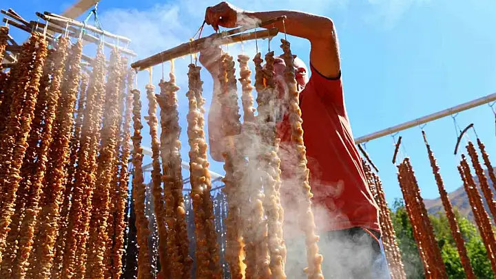 Elazığ'ın Değirmenönü (Zerteriç) köyünde kış aylarının vazgeçilmez lezzeti orcik yapımı, asırlardır süregelen gelenekler çerçevesinde devam ediyor. Üzüm ve ceviz hasadının ardından köy halkı, orcik üretimi için mesaiye başladı. Üzümler sıkıldıktan sonra şıra, özel toprakla mayalanıyor ve kazanda kaynatılıyor. Yüzeye çıkan 'paf' temizlendikten sonra un eklenip bulamaç haline getiriliyor ve cevizler ipe dizilerek karışıma batırılıyor. Bu gelenek, köy halkının hem geçim kaynağı hem de kış aylarının vazgeçilmez lezzeti olmaya devam ediyor.