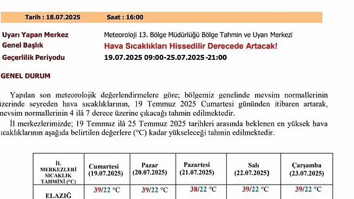 Meteoroloji 13. Bölge Müdürlüğü'nden yapılan açıklamada, 'Yapılan son meteorolojik değerlendirmelere göre, bölgemiz genelinde mevsim normallerinin üzerinde seyreden hava sıcaklıklarının, 19 Temmuz 2025 Cumartesi gününden itibaren artarak, mevsim normallerinin 4 ila 7 derece üzerine çıkacağı tahmin edilmektedir. Sıcaklıklardaki yükselişe bağlı olarak güneş ışınlarının dik geldiği 11 ile 16 saatleri arasında başta yaşlılar, çocuklar ve kronik rahatsızlığı olan vatandaşlarımızın sıcak çarpmasına karşı dikkatli ve tedbirli olmaları önem arz etmektedir' denildi.