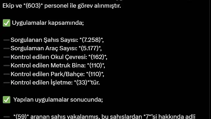 Uygulamalarda, 59 aranan şahıs yakalanırken, 7 şahsa adli ve 52 şahsa idari işlem yapıldığı bildirildi. Aynı zamanda 792 araca toplam 1 milyon 881 bin 57 TL idari para cezası uygulandığı ve 3 aracın trafikten men edildiği aktarıldı.