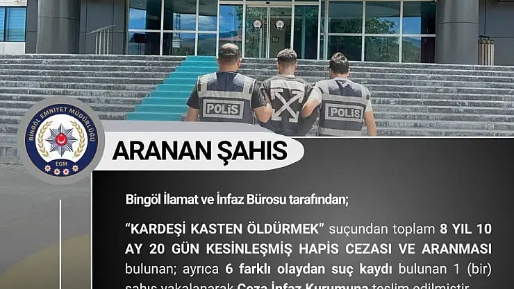 Bingöl'de 8 yıl 10 ay 20 gün kesinleşmiş hapis cezası ile aranan zanlı polis ekipleri tarafından yakalandı.
