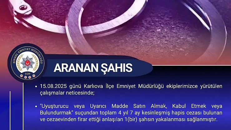 Bingöl'de 4 yıl 7 ay kesinleşmiş hapis cezası bulunan ve cezaevinden firar ettiği tespit edilen şüpheli, polis ekipleri tarafından yakalandı.