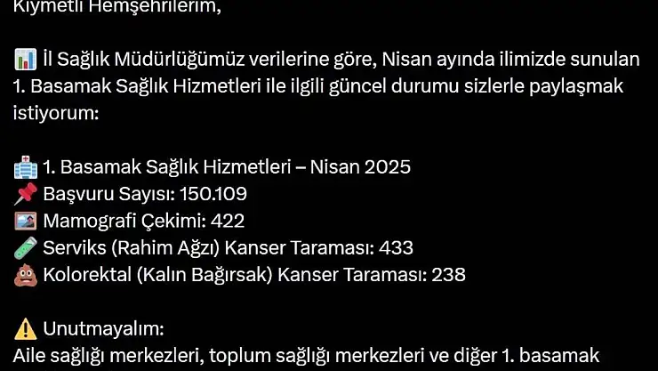 Bingöl Valisi Dr. Hamdi Usta, İl Sağlık Müdürlüğü verilerini paylaştı. Verilere göre Nisan ayında kentte sunulan 1. Basamak Sağlık Hizmetlerine 150 bin 109 başvuru alındı. Başvurulardan bin 93 kişinin kanser taraması yapıldığı bildirildi.