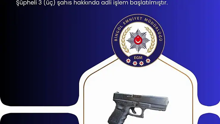 Bingöl Emniyet Müdürlüğü Asayiş Şube Müdürlüğü motosikletli polis timlerince yapılan çalışmalar neticesinde 1 adet Glock Gen Austria marka ruhsatsız tabanca, 1 adet şarjör ve 11 adet 9 çarpı 19 milimetre çapında dolu fişek ele geçirildi. Olaya ilişkin şüpheli 3 kişi hakkında adli işlem başlatıldı.