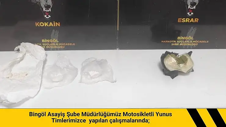 Bingöl Emniyet Müdürlüğü Asayiş Şube Müdürlüğü motosikletli yunus timlerince yapılan çalışmalar neticesinde 20 gram toz esrar ile 5 gram kokain ele geçirildi. 2 şüpheli hakkında adli işlem başlatıldı.