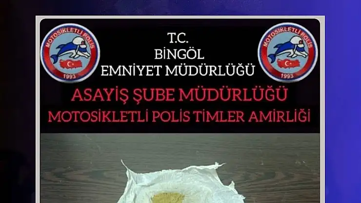Bingöl Emniyet Müdürlüğü Asayiş Şube Müdürlüğü Motosikletli Polis Timleri Amirliği ekiplerince şüpheli bir şahsın üzerinde yapılan aramada 2.84 gram esrar maddesi ele geçirildi. Şahıs hakkında adli işlemlere başlandığı belirtildi.