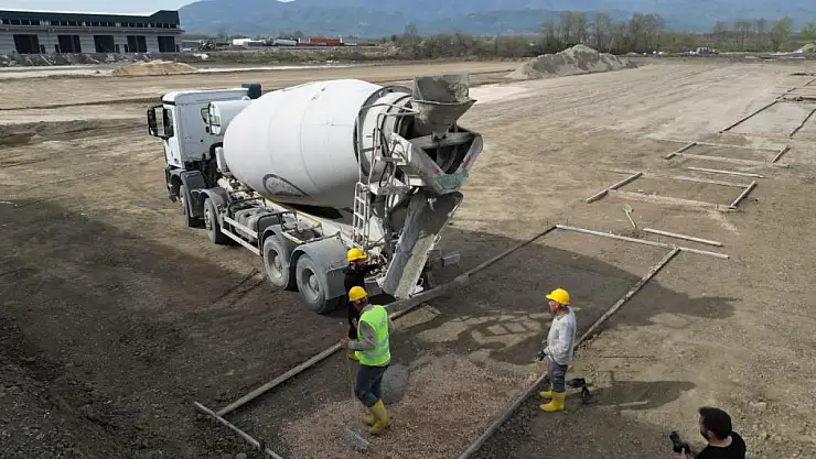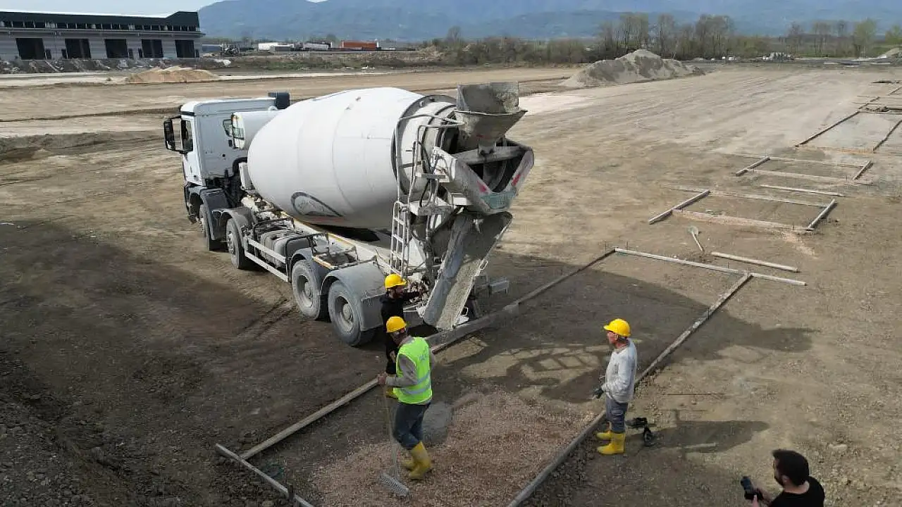 Düzce Belediyesi'nin birinci etabını tamamladığı modern sanayi sitesi projesinde, ikinci ve üçüncü etaplardaki inşaat çalışmaları hızla sürüyor. 164 dükkanın yer alacağı projede temel beton döküm işlemleri devam ediyor.