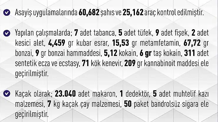 Yapılan çalışmalarda; 7 adet tabanca, 5 adet tüfek, 9 adet fişek, 2 adet kesici alet, 4,459 gram kubar esrar, 15,53 gram metamfetamin, 67,72 gram bonzai, 9 gram bonzai hammaddesi, 5,12 kokain, 6 gram taş kokain, 311 adet sentetik ecza ve ecstasy, 71 kök kenevir, 209 gr kannabinoit maddesi, kaçak olarak; 23 bin 40 adet makaron, 1 dedektör, 5 adet muhtelif kazı malzemesi, 7 kilo kaçak çay malzemesi, 50 paket bandrolsüz sigara ele geçirildi.