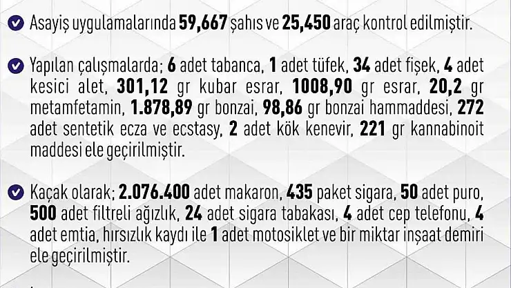 Yapılan çalışmalarda; 6 adet tabanca, 1 adet tüfek, 34 adet fişek, 4 adet kesici alet, 301,12 gram kubar esrar, 1008,90 gram esrar, 20,2 gram metamfetamin, 1.878,89 gram bonzai, 98,86 gram bonzai hammaddesi, 272 adet sentetik ecza ve ecstasy, 2 adet kök kenevir, 221 gr kannabinoit maddesi ele geçirilirken kaçak olarak ise 2 milyon 76 bin 400 adet makaron, 435 paket sigara, 50 adet puro, 500 adet filtreli ağızlık, 24 adet sigara tabakası, 4 adet cep telefonu, 4 adet emtia, hırsızlık kaydı ile 1 adet motosiklet ve bir miktar inşaat demiri ele geçirildi.