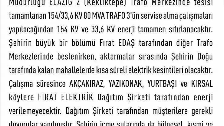 Çalışma süresince şehrin büyük bir bölümü Fırat EDAŞ tarafından diğer trafo merkezlerinden beslenmeye devam edecek olsa da, doğu mahallelerinde kısa süreli kesintiler yaşanacağı belirtildi. Özellikle Akçakiraz, Yazıkonak, Yurtbaşı beldeleri ile kırsal köylerde elektrik verilemeyecek. Kesintinin su şebekesini de etkileyebileceğini ve bölgesel, kısmi içme suyu kesintilerinin yaşanabileceği ifade edildi.