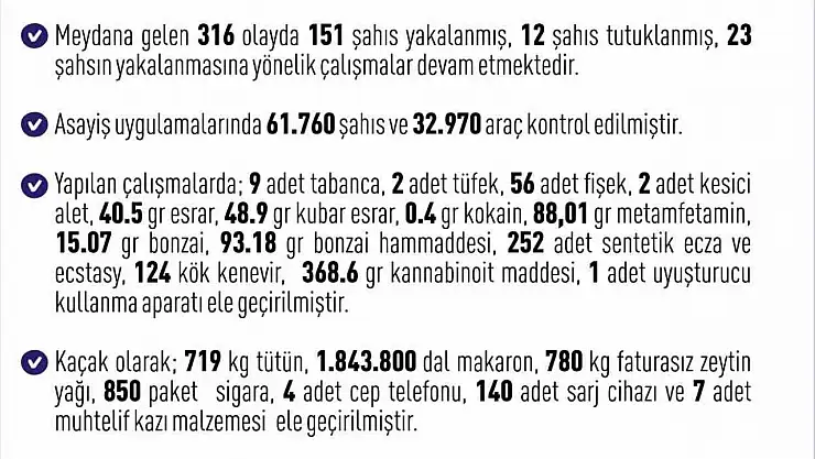 Yapılan çalışmalarda; 9 adet tabanca, 2 adet tüfek, 56 adet fişek, 2 adet kesici alet, 40.5 gram esrar, 48.9 gram kubar esrar, 0.4 gram kokain, 88,01 gram metamfetamin, 15.07 gram bonzai, 93.18 gram bonzai hammaddesi, 252 adet sentetik ecza ve ecstasy, 124 kök kenevir, 368.6 gram kannabinoit maddesi, 1 adet uyuşturucu kullanma aparatı, Kaçak olarak 719 kilogram tütün, 1.843.800 dal makaron, 780 kilogram faturasız zeytin yağı, 850 paket sigara, 4 adet cep telefonu, 140 adet sarj cihazı ve 7 adet muhtelif kazı malzemesi ele geçirildi.