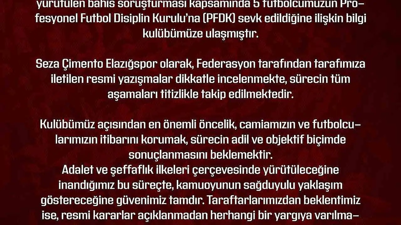 Elazığspor Kulübü’nden yapılan açıklamada, "Türkiye Futbol Federasyonu tarafından profesyonel liglere yönelik yürütülen bahis soruşturması kapsamında 5 futbolcumuzun Profesyonel Futbol Disiplin Kurulu’na (PFDK) sevk edildiğine ilişkin bilgi kulübümüze ulaşmıştır. Seza Çimento Elazığspor olarak, Federasyon tarafından tarafımıza iletilen resmi yazışmalar dikkatle incelenmekte, sürecin tüm aşamaları titizlikle takip edilmektedir. Kulübümüz açısından en önemli öncelik, camiamızın ve futbolcularımızın itibarını korumak, sürecin adil ve objektif biçimde sonuçlanmasını beklemektir. Adalet ve şeffaflık ilkeleri çerçevesinde yürütüleceğine inandığımız bu süreçte, kamuoyunun sağduyulu yaklaşım göstereceğine güvenimiz tamdır. Taraftarlarımızdan beklentimiz ise, resmi kararlar açıklanmadan herhangi bir yargıya varılmaması ve sürecin tamamlanmasının sabırla beklenmesidir. Gelişmeler, kulübümüz tarafından yakından izlenmekte olup, resmi bilgilendirmeler şeffaf biçimde kamuoyu ile paylaşılmaya devam edilecektir" denildi.