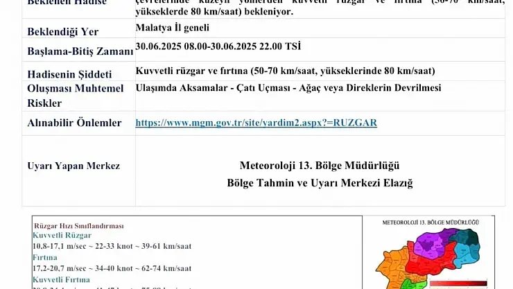 Meteoroloji 13. Bölge Müdürlüğü, Malatya genelinde 30 Haziran Pazartesi günü etkili olması beklenen kuvvetli rüzgar ve fırtına için uyarıda bulundu.