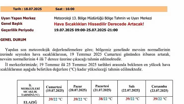 Meteoroloji 13. Bölge Müdürlüğü’nden yapılan açıklamada, "Yapılan son meteorolojik değerlendirmelere göre, bölgemiz genelinde mevsim normallerinin üzerinde seyreden hava sıcaklıklarının, 19 Temmuz 2025 Cumartesi gününden itibaren artarak, mevsim normallerinin 4 ila 7 derece üzerine çıkacağı tahmin edilmektedir. Sıcaklıklardaki yükselişe bağlı olarak güneş ışınlarının dik geldiği 11 ile 16 saatleri arasında başta yaşlılar, çocuklar ve kronik rahatsızlığı olan vatandaşlarımızın sıcak çarpmasına karşı dikkatli ve tedbirli olmaları önem arz etmektedir" denildi.