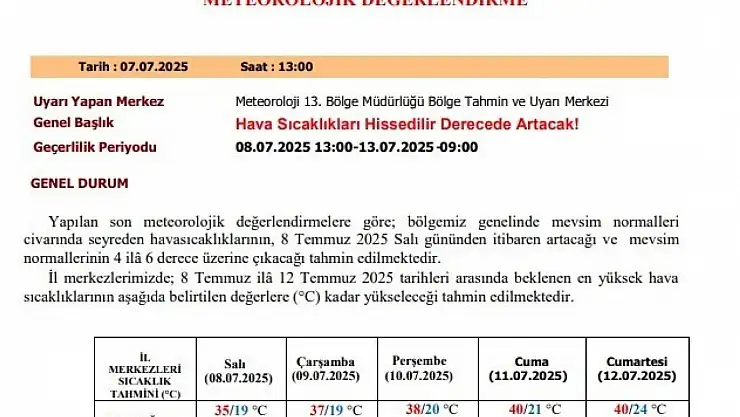 Meteoroloji 13. Bölge Müdürlüğü’nden yapılan açıklamada, "Yapılan son meteorolojik değerlendirmelere göre; bölgemiz genelinde mevsim normalleri civarında seyreden hava sıcaklıklarının, 8 Temmuz 2025 Salı gününden itibaren artacağı ve mevsim normallerinin 4 ila 6 derece üzerine çıkacağı tahmin edilmektedir. Sıcaklıklardaki yükselişe bağlı olarak güneş ışınlarının dik geldiği 11 ile 16 saatleri arasında başta yaşlılar, çocuklar ve kronik rahatsızlığı olan vatandaşlarımızın sıcak çarpmasına karşı dikkatli ve tedbirli olmaları önem arz etmektedir" denildi.