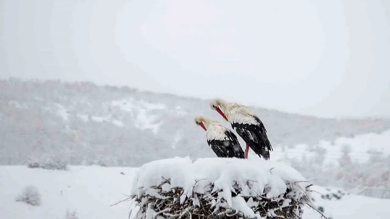 Mevsimleri karıştıran leylekler, karla karşılaştı