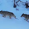 Uzun süre karlı zirvelerde yiyecek arayan kurtlar, daha sonra ormanlık alana doğru giderek gözden kaybolurken o anlar, dron ile kayıt altına alındı.