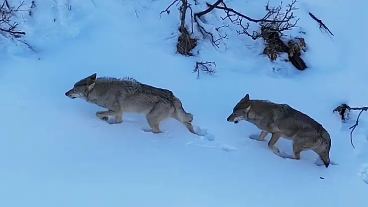 Tunceli'de, Munzur Vadisi Milli Parkı'nda 3 bireyden oluşan kurt ailesi, dron ile görüntülendi.