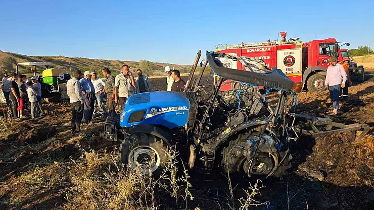 Elazığ’ın Kovancılar ilçesinde çıkan arazi yangınında alevler ortasında kalan traktör kullanılamaz hale geldi.