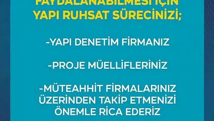 Yeşilyurt Belediyesi İmar ve Şehircilik Müdürlüğü’nden yapılan bilgilendirmeye göre; 30 Haziran 2025 tarihine kadar Yapı Ruhsatı alınmadığı takdirde Çevre, Şehircilik ve İklim Değişikliği Bakanlığınca verilen 750 bin TL hibe ve 750 bin TL kredi hakkından faydalanılamayacağı ifade edildi.